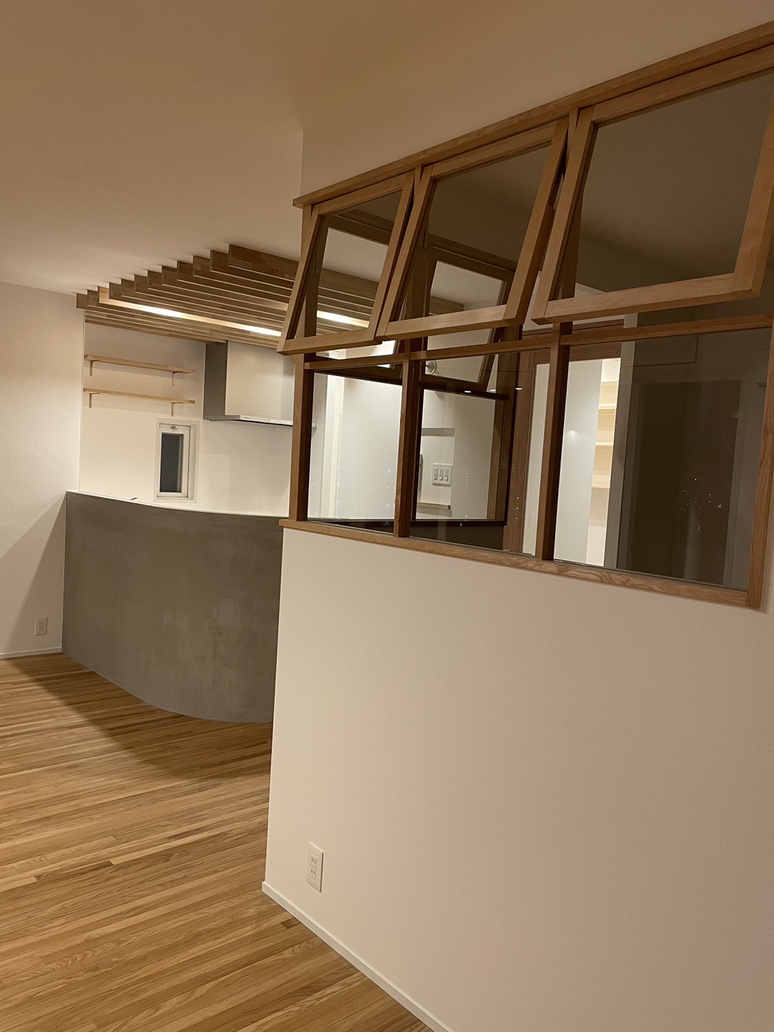 オーダーで製作した開閉式の室内窓も良い雰囲気を出しています。